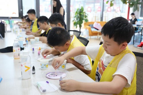 在仁和街道党群服务中心首日课堂中,志愿者潘文烨用棉签蘸取洗洁精轻点牛奶颜料盘,彩色漩涡瞬间绽放。“原来破坏表面张力可以这么美!”孩子们惊叹着以棉签为笔,在牛奶上勾勒家乡稻田。同步开展的劳动教育中,他们亲手清洗实验器具,将环保意识写入实践报告。